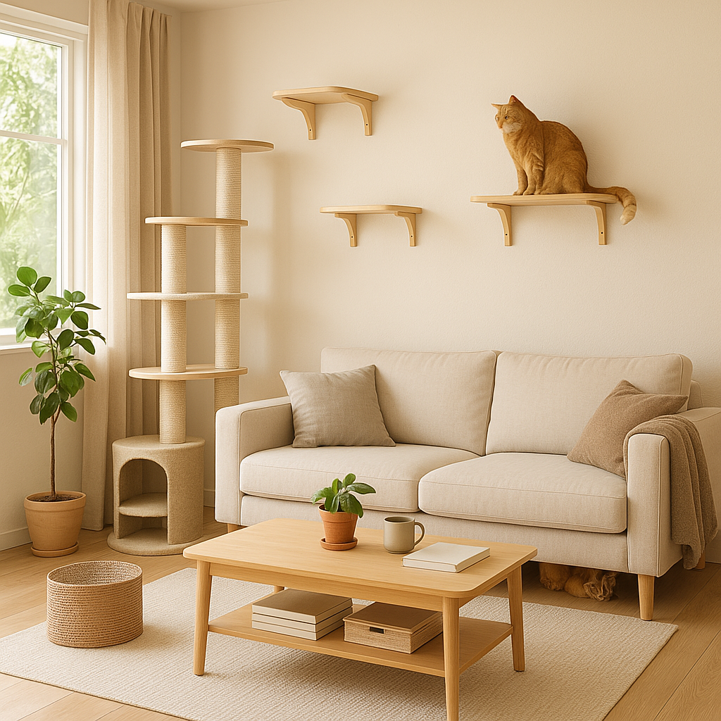 A cozy, beige-toned living room with a cat tree, wall-mounted shelves, and soft natural light, designed as a cat-friendly space.A warm, minimalist living room styled for both comfort and cat-friendly living.