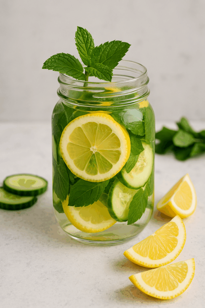 Slice lemon and cucumber, add mint leaves, and let them sit in cold water for a few hours. - Hot Honey Lemon Tea
